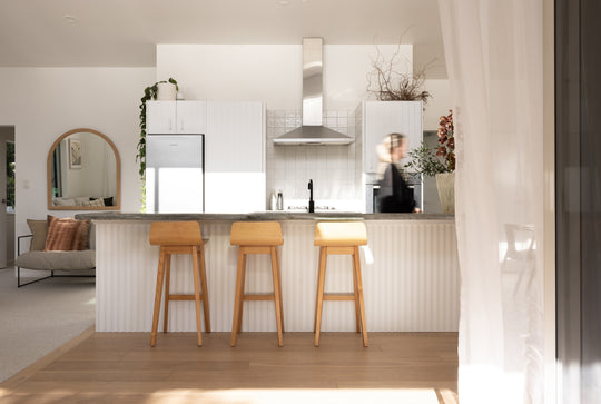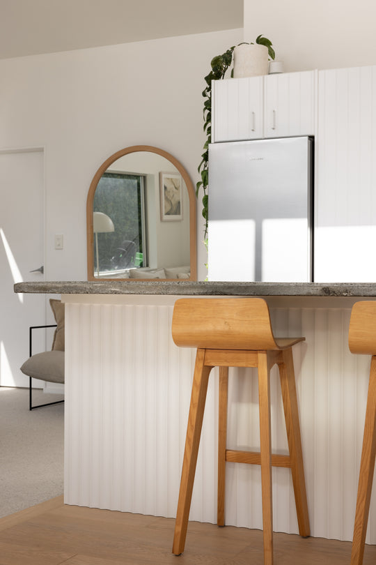 A renovated home featuring timber panelling across the kitchen, bedroom, laundry, and office nook to add consistency and warmth throughout the space.