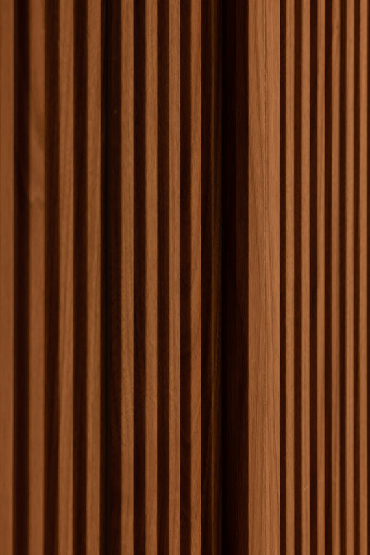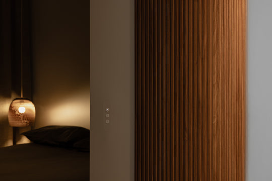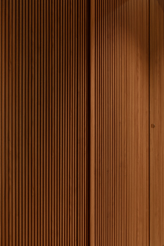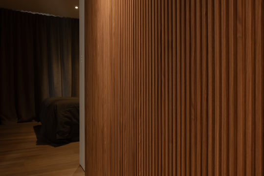 A refined apartment interior where warm, textured timber accents, hidden doors, and full-length mirrors create a cohesive, elevated, and thoughtfully detailed living space.