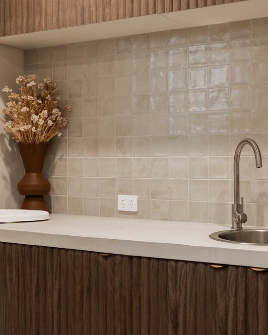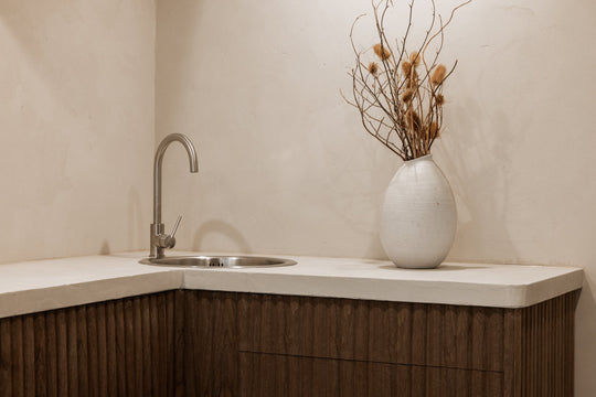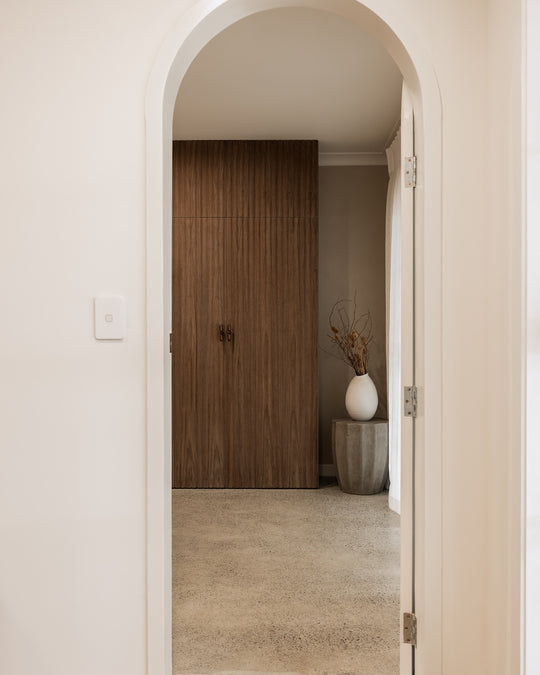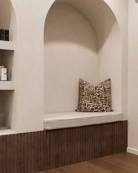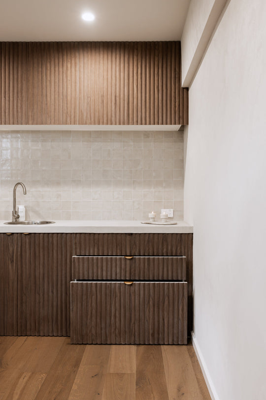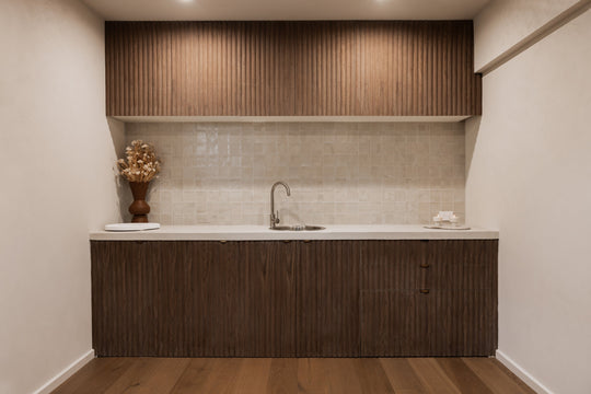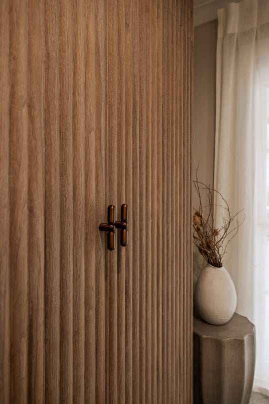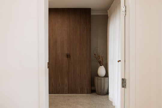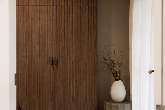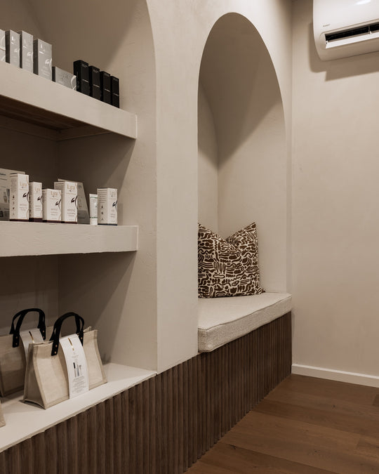 A calm, luxurious studio interior defined by warm black walnut panelling, creating a serene setting for relaxation and pampering.