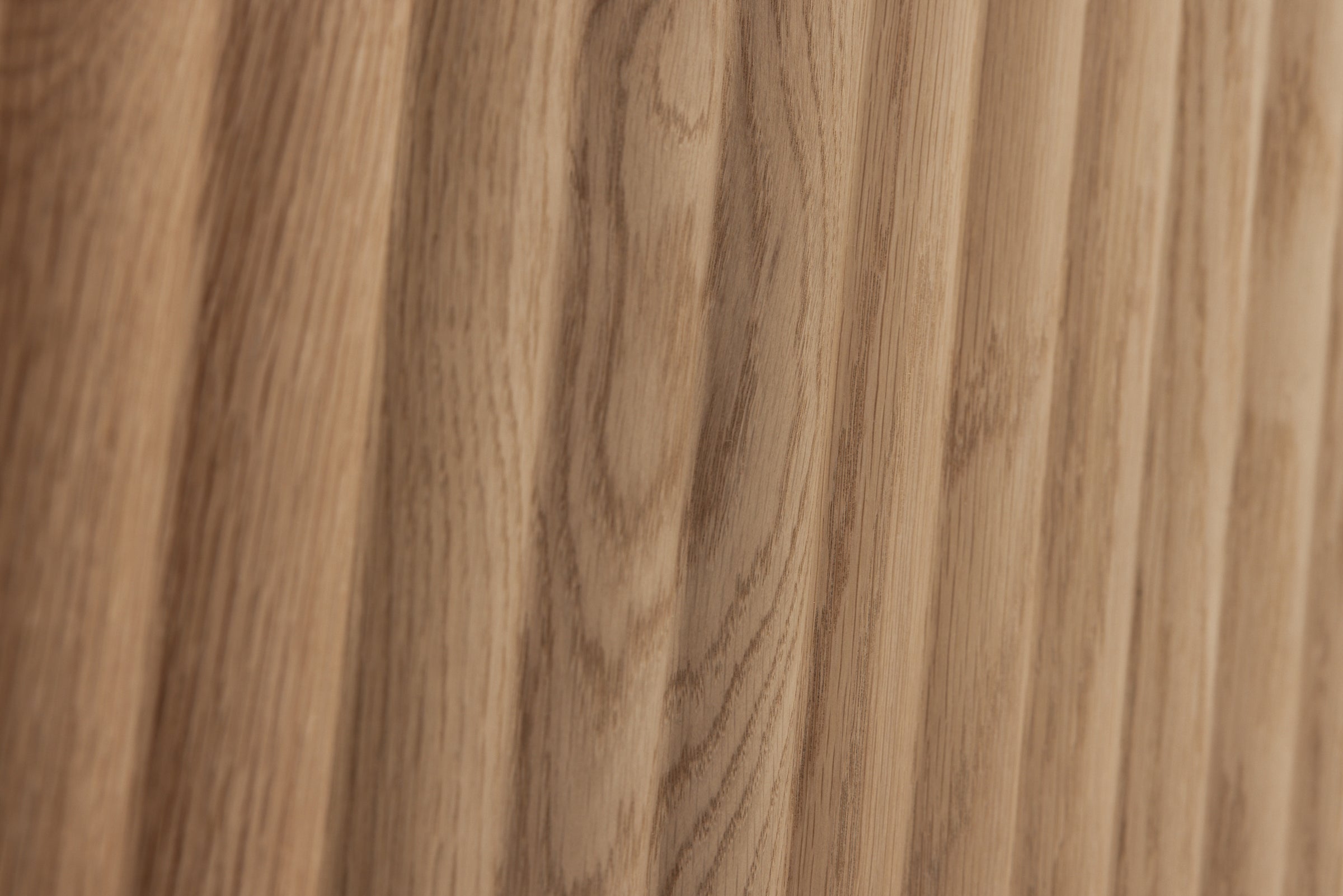 Designed to accommodate both flat and curved surfaces, the Wave Flow is a 2730mm-long panel that conforms to a 150mm radius. Made with an MDF core and a ply backing, with the reverse side factory-sealed in a clear coat to balance the panel and improve stability. Crafted with a raw White Oak veneer for a customisable finish.
